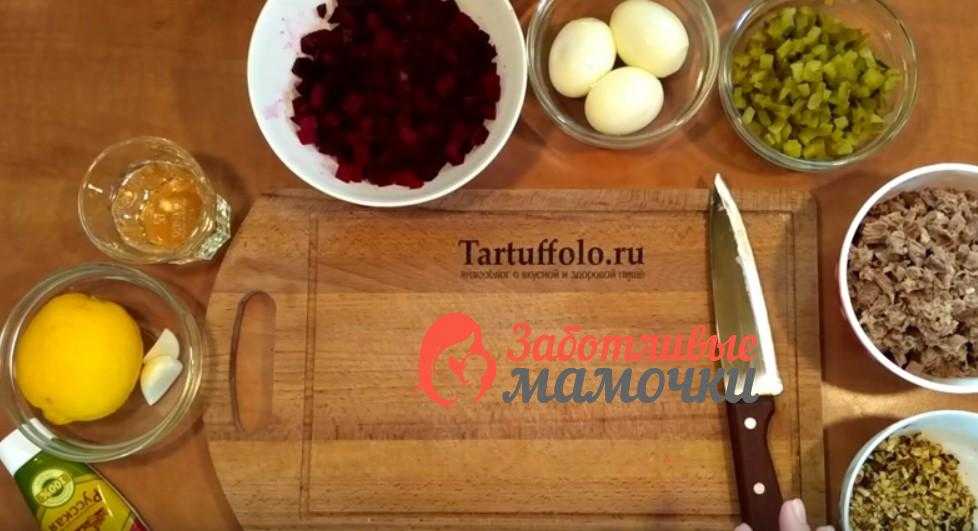 свекла – 2шт.,говядина – 500г, маринованные огурцы – 4-5шт., белки – 3шт., грецкие орехи – 50г.
