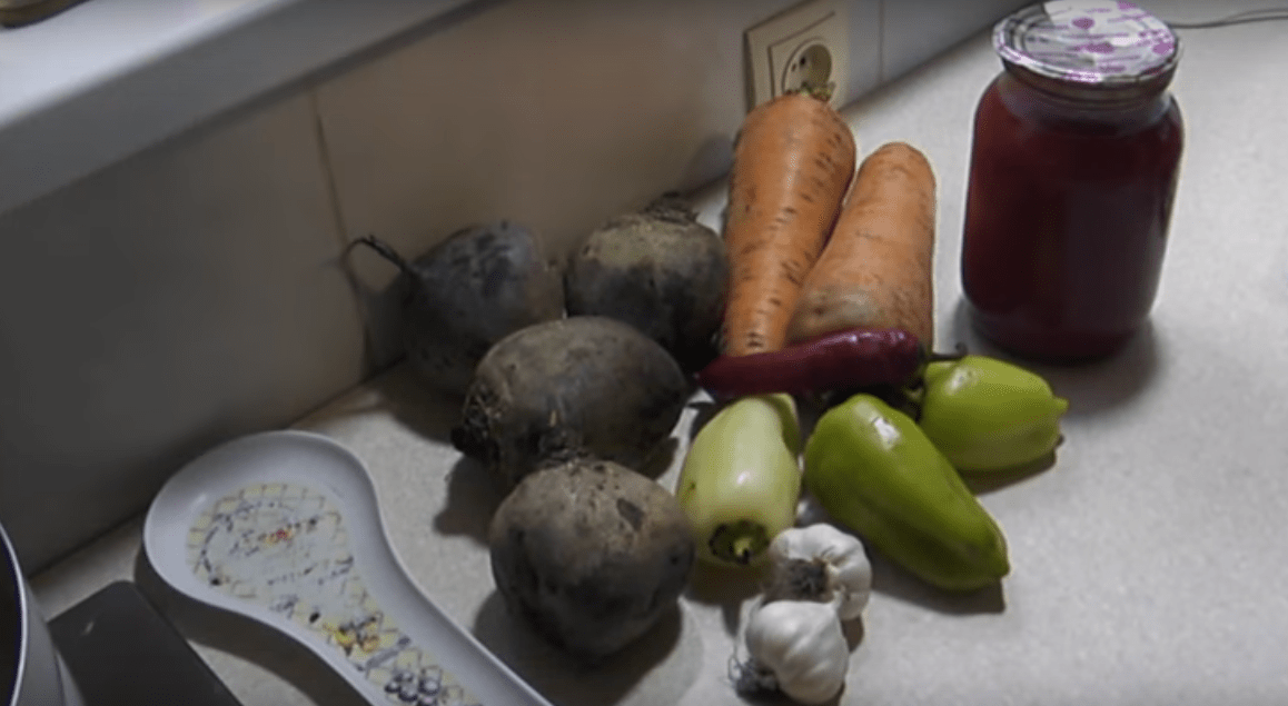 - Вес ингредиентов — уже очищенные овощи. Режем их произвольно в близком размере с интересными акцентами. Например, свеклу, лук, перец — некрупно. Обычная терка, шинковка ножом и короткие полоски — в самый раз. А очищенные от кожицы помидоры и морковочку — покрупнее.