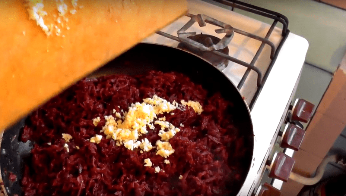 Свеклу натираем на крупной терке. Затем, чтобы уменьшить время ее приготовления, выжимаем из нее сок. Удобнее всего это делать руками.