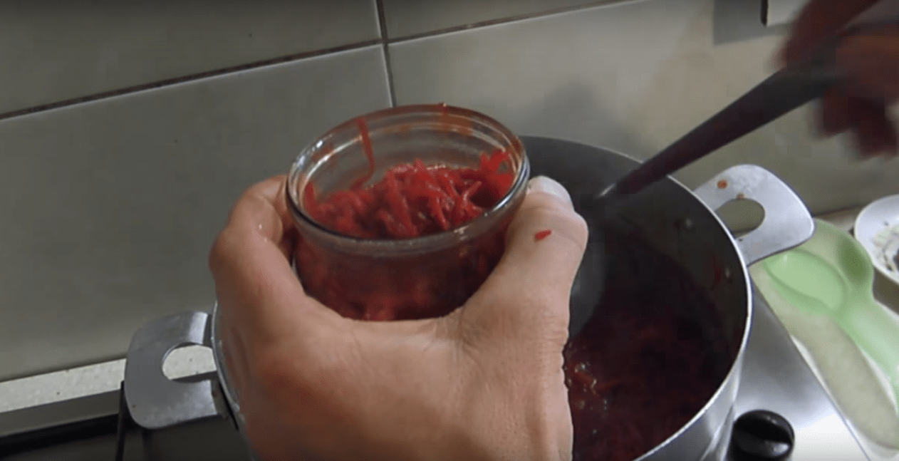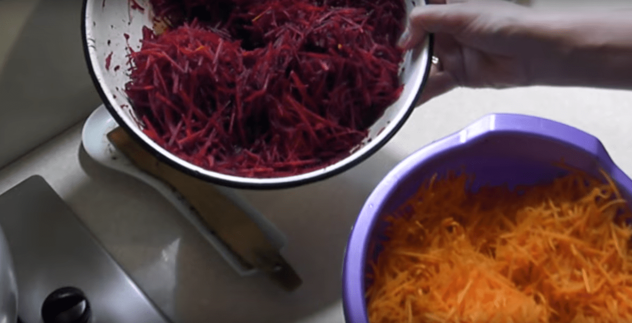 Берем горсточку в руку и сильно сдавливаем. И так, постепенно, отжимаем всю натертую свеклу.