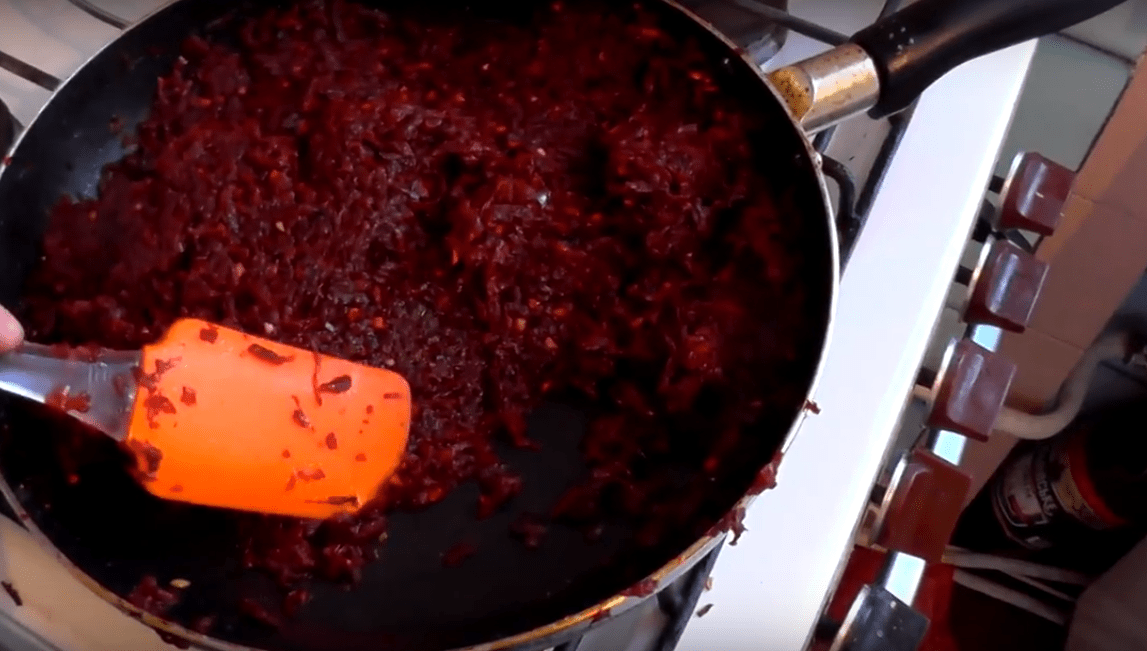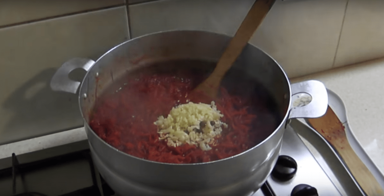 3. Как только все готово, приступайте непосредственно к приготовлению. В казанок влейте растительное масло, высыпьте лук и пассируйте минут 10, плюс морковь и болгарский перец, тушите еще 7 минут, перемешивая. Затем свекла, томатная паста, сахар и соль, острый перец и уксус 100 мл, чтобы буряк не потерял свой бордовый цвет. Как только масса закипит тушите под закрытой крышкой 40-45 минут.