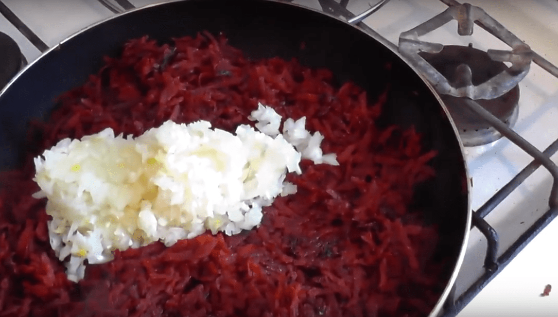 1. В первую очередь отварите до полной готовности свеклу и снимите шкурку. Репчатый лук покрошите на полукольца. Жарьте его до прозрачности на сковороде с растительным маслом.