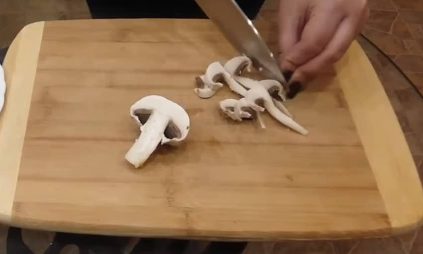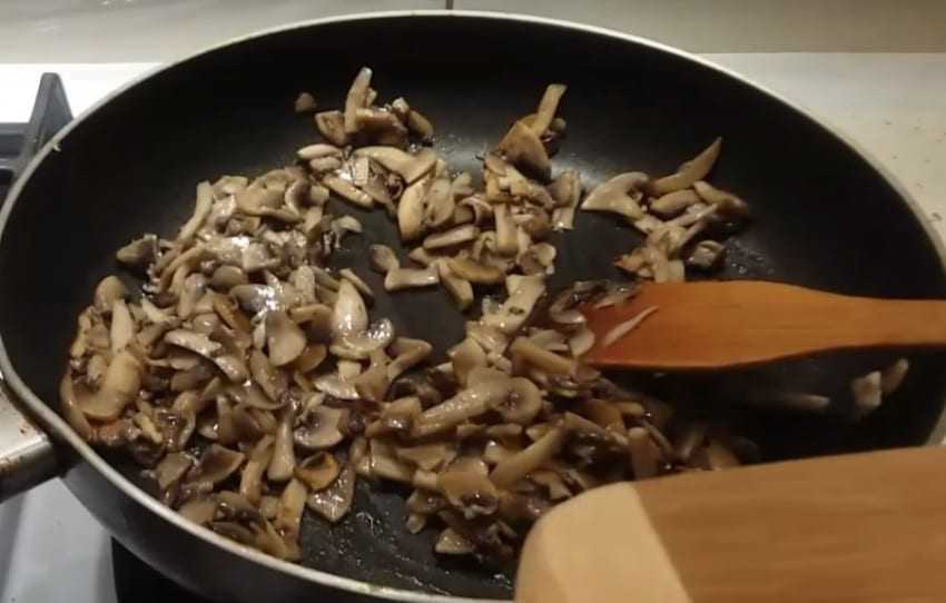 2. Переходим к грибам. Их моем и чистим. После того, как порежем такими же тонкими ломтиками, выкладываем в сковороду и, добавив туда немного масла, обжариваем до готовности. Не забудем поперчить и присолить за пять минут до конца приготовления.