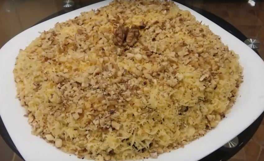 11. Грецкие орехи измельчите ножом и присыпьте произвольно верх блюда. Для украшения идеально подойдут целые ореховые дольки.