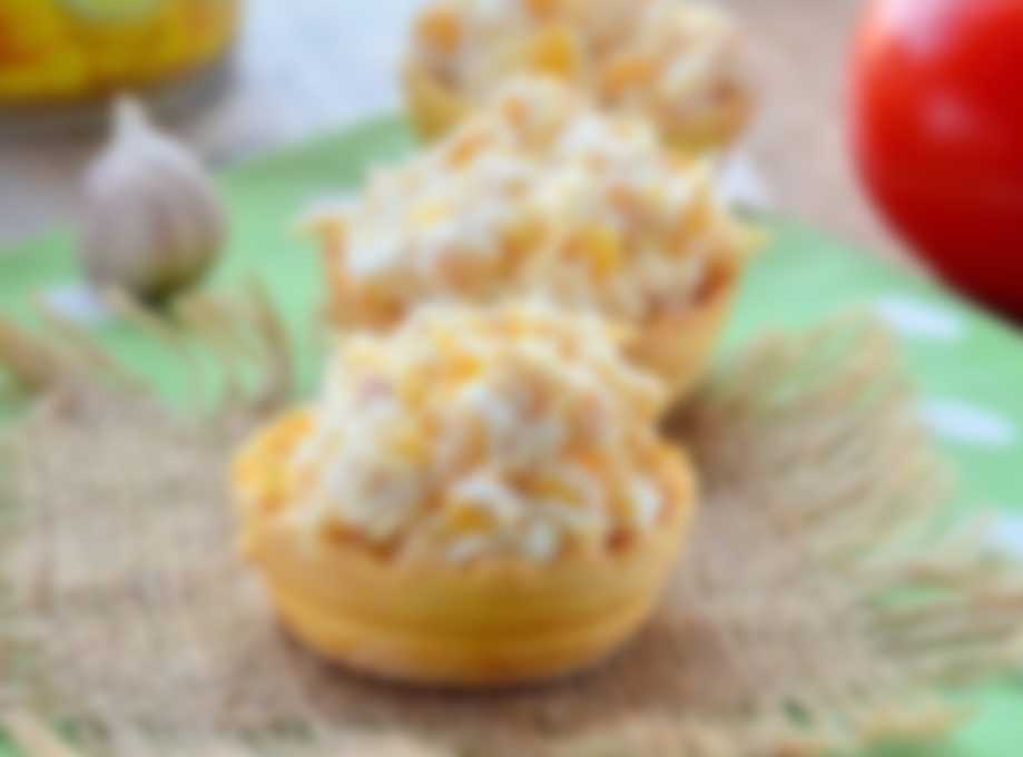 Видеорецепт приготовления тарталеток с крабовыми палочками и кукурузой