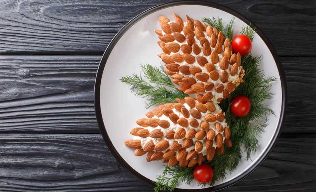 Сформированный в виде шишек салат выглядит очень празднично, нарядно. Декорировать его можно еловой веточкой, свежим розмарином, укропом.