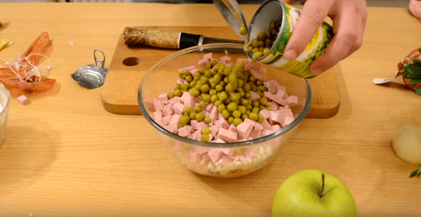 - Всю нарезку помещаем в салатник. Туда же добавим горошек (без сока).