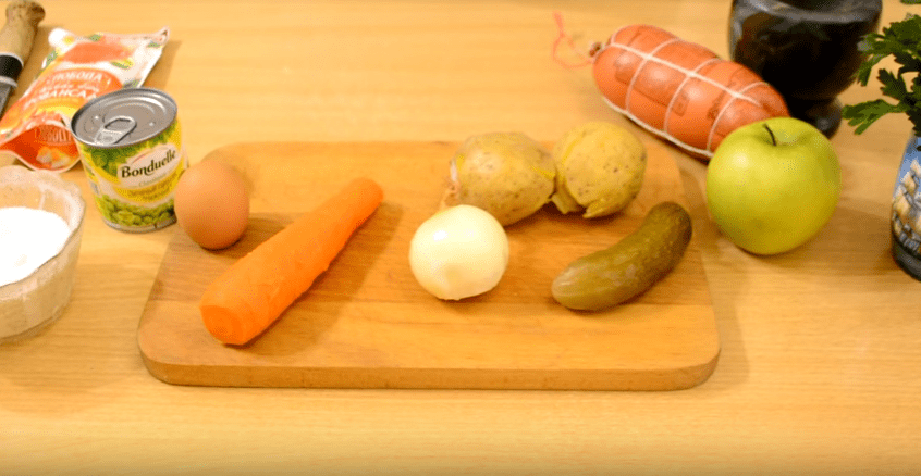 Сваренные морковь, картофель и яйца почистите. Далее измельчаем эти и другие ингредиенты. В частности, сыр, морковку и картофель нужно натереть на крупной терке в отдельные тарелочки или мисочки. Огурцы соленые и колбасу нарежьте средники кубиками или ровной соломкой – тоже в отдельную посуду каждый ингредиент