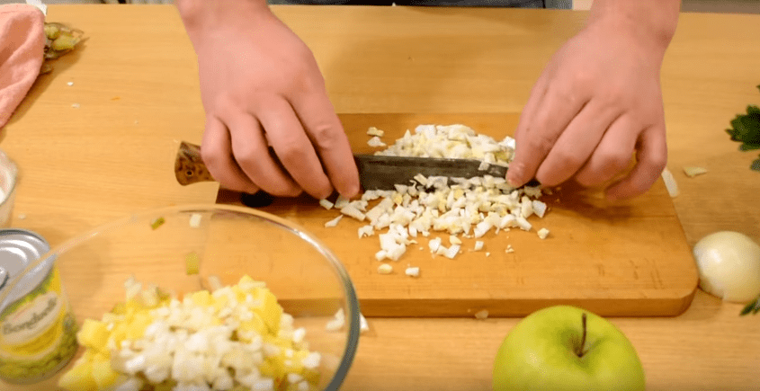 1. В первую очередь по традиции начинаем с нарезки всех продуктов. Овощи, куриное мясо, маринованные огурчики и яйца складываем в объёмную миску. Туда же отправляем и мелко рубленый лук.