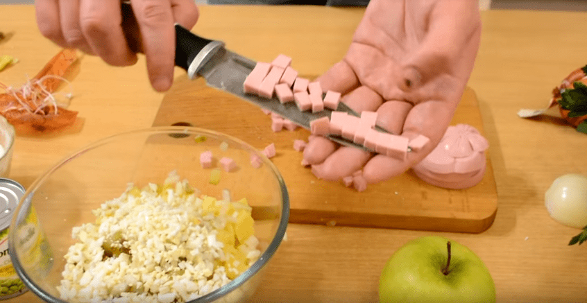Колбасу следует нарезать на небольшие, ровные кубики.