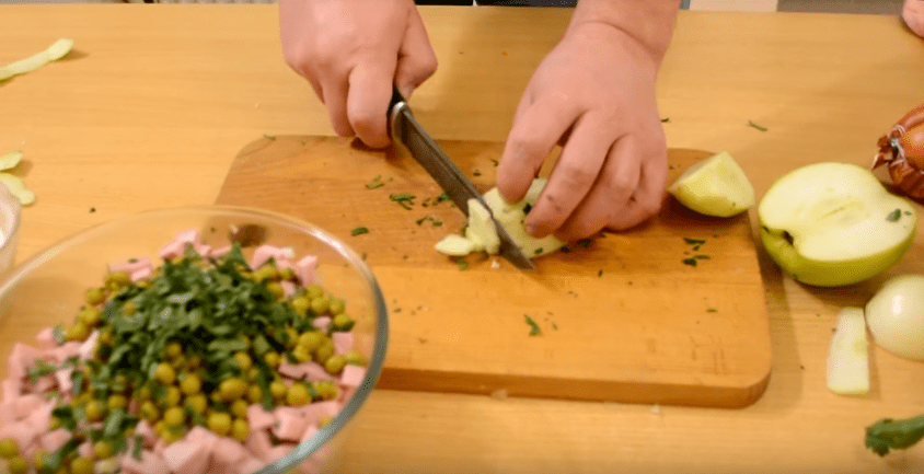 2. Далее кубиками режем яблоко вместе с кожурой. В идеале это должен быть кисло-сладкий фрукт. Его вкус отлично гармонирует с остальным составом салата.
