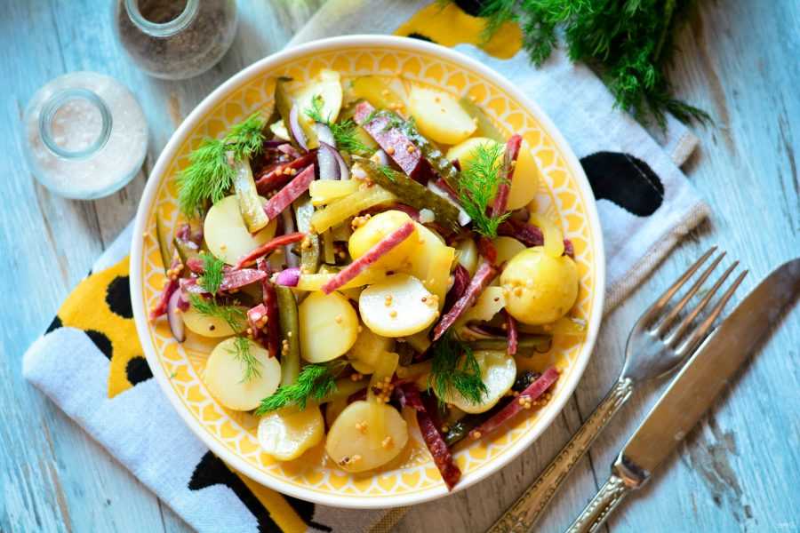 Особенно хорош этот салат с сырокопченой колбасой, но вы можете использовать любую, которая вам по душе. Зерновая горчица и оливковое масло – идеальная заправка.