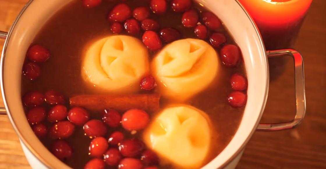 - Как только пунш начал закипать, выключите его. Сверху выложите яблоки «лицом» кверху. При желании всыпьте размороженную клюкву.