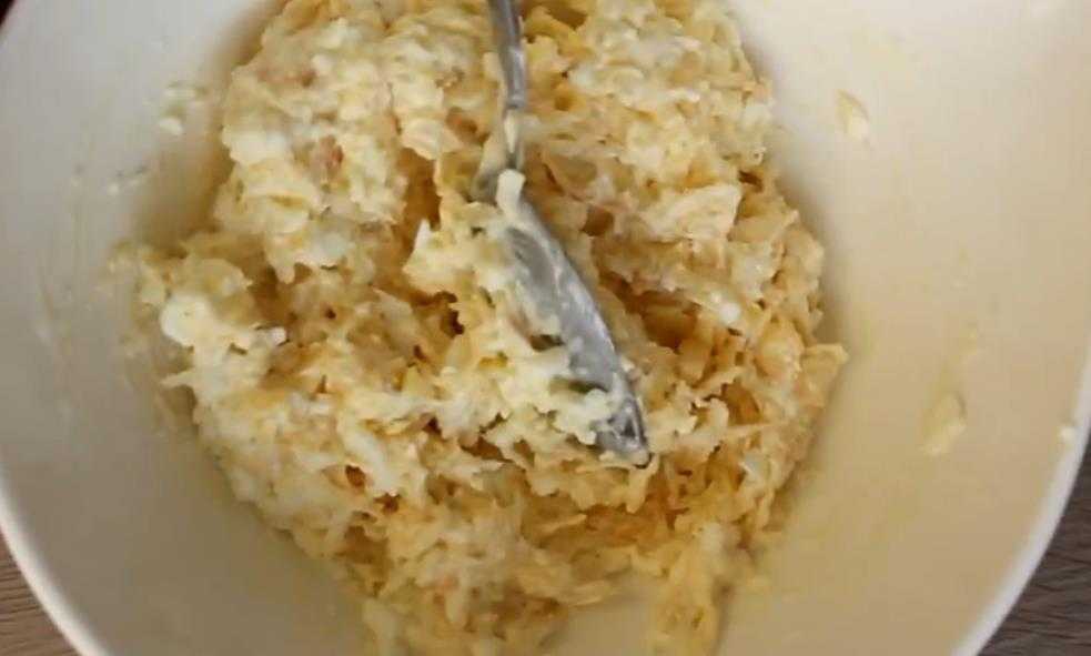 - Плавленый сыр и яйцо трем на терке со средними ячейками. Добавим измельченную зелень укропа и заправим столовой ложкой майонеза. Старательно перемешаем продукты — начинка готова!