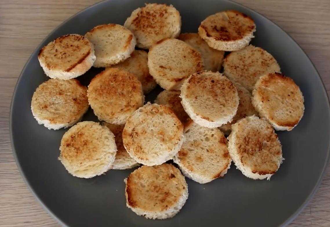 Тонко нарезать батон и срезать с него корочки. По желанию – вырезать из мякиша кружочки. Выложить подготовленный батон на сковородку, смазанную тонким слоем масла, и подрумянить его с обеих сторон.