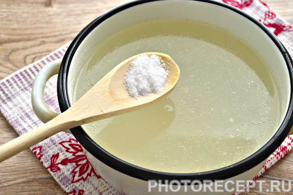 - Сварим бульон. Тщательно промоем косточки, зальем их водой и ставим на огонь. Даем закипеть, и пусть проварятся 5 минут. Снимаем с огня, сливаем воду, промываем косточки от пены и снова заливаем холодной водой. Возвращаем на плиту и варим на умеренном огне. Жидкость не должна кипеть, а только тихонечко побулькивать. Тогда бульон будет прозрачный и вкусный. Солить необходимо уже в конце.