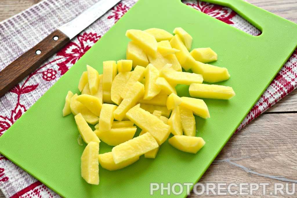 Шаг 4. Картофель нарежьте на кубики. Дождитесь когда суп закипит, после чего добавки в блюдо картофель.