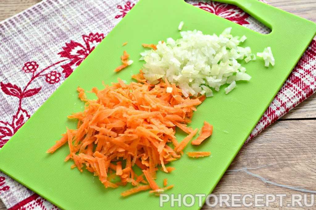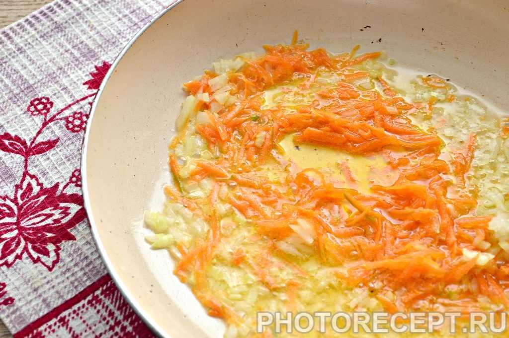 Шаг 2. Тем временем очистите морковь и лук. Морковь нарежьте тонкими колечками. Лук мелко нашинкуйте. Разогрейте сковороду с оливковым маслом и обжарьте овощи часто помешивая для равномерной обжарки.