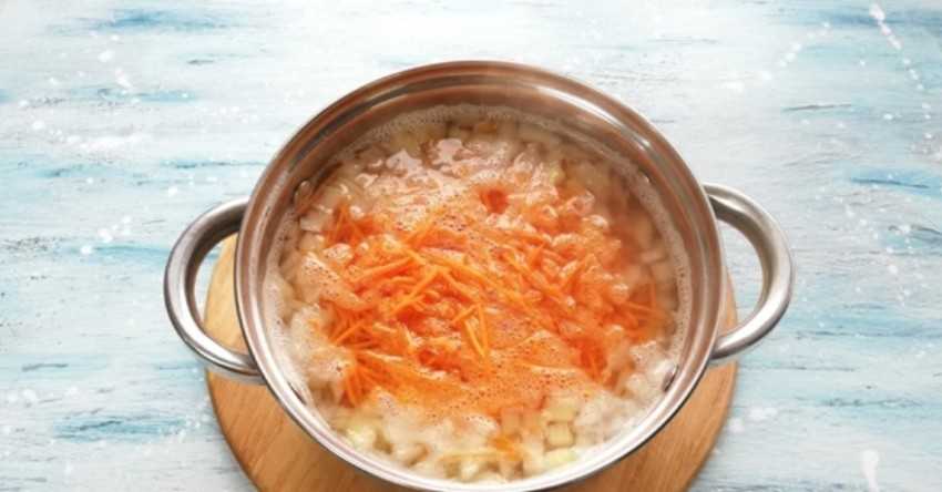 - Пока картошка доходит в рассольнике, вы можете приготовить обжарку – тёртую морковку с мелко нарубленным луком пассируйте на сковороде.